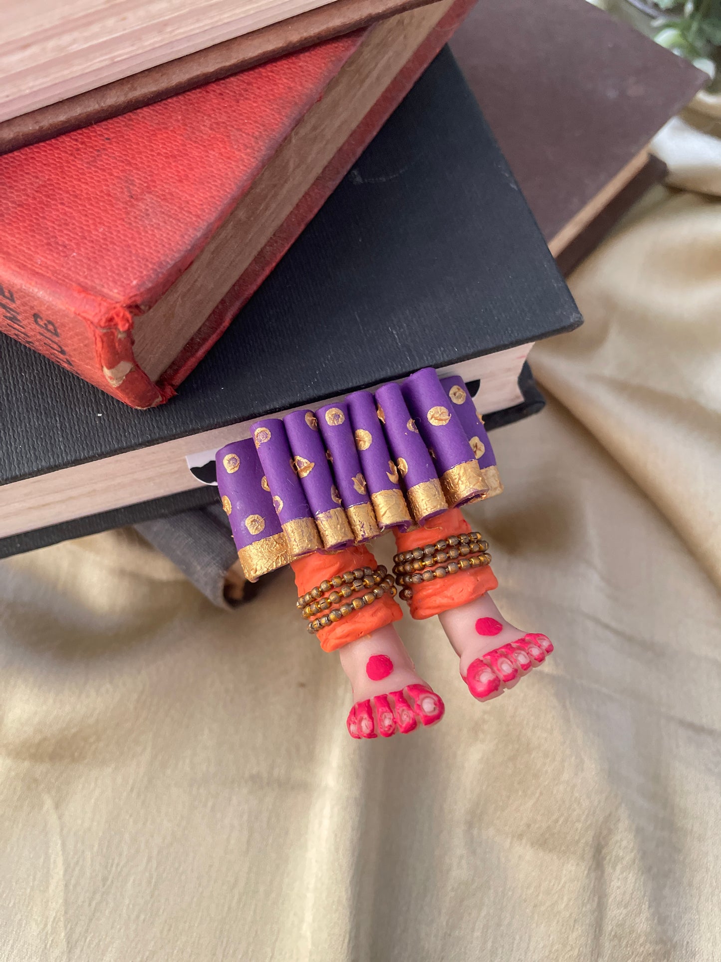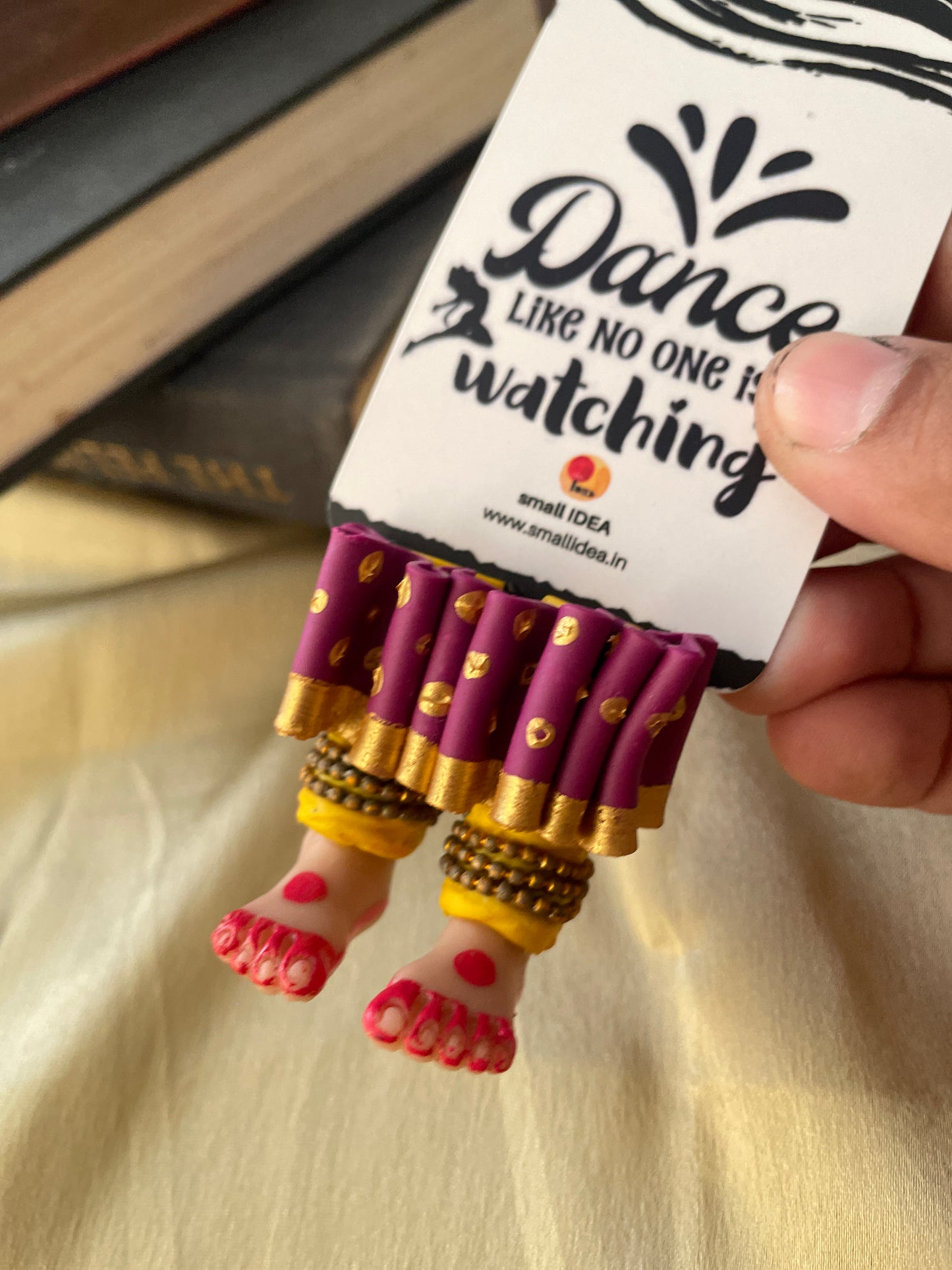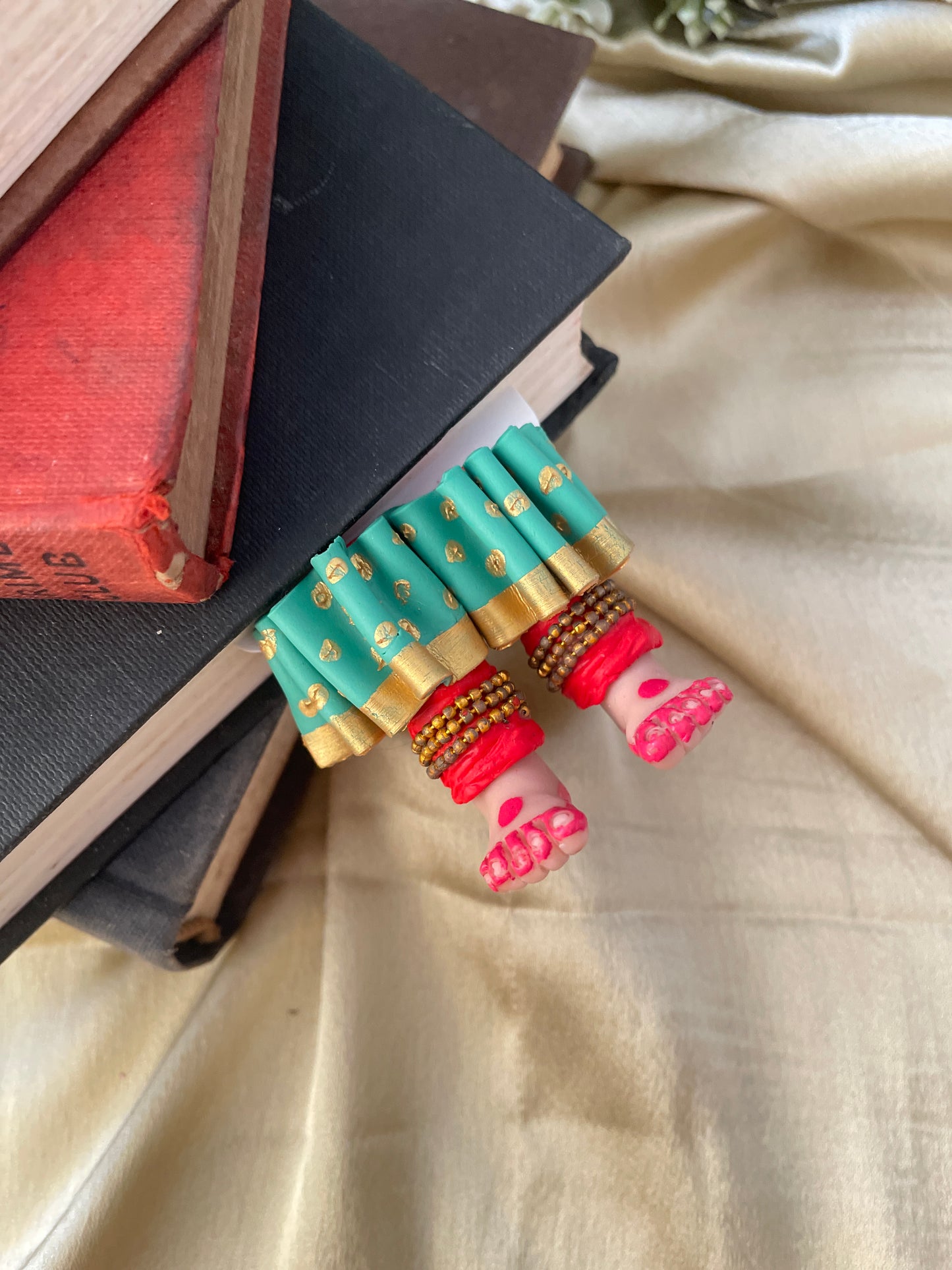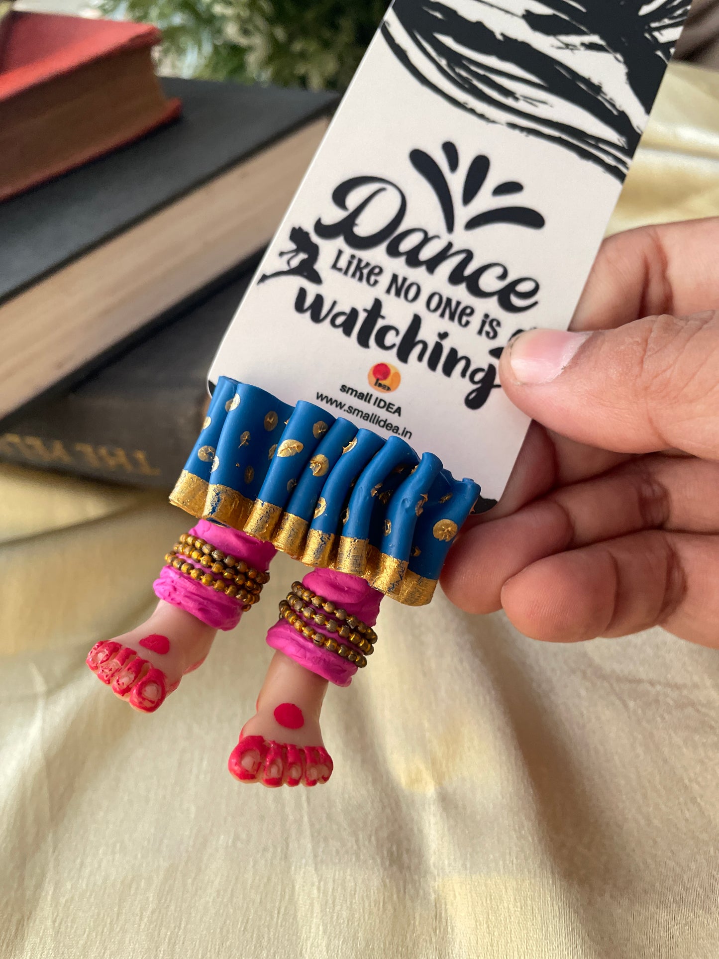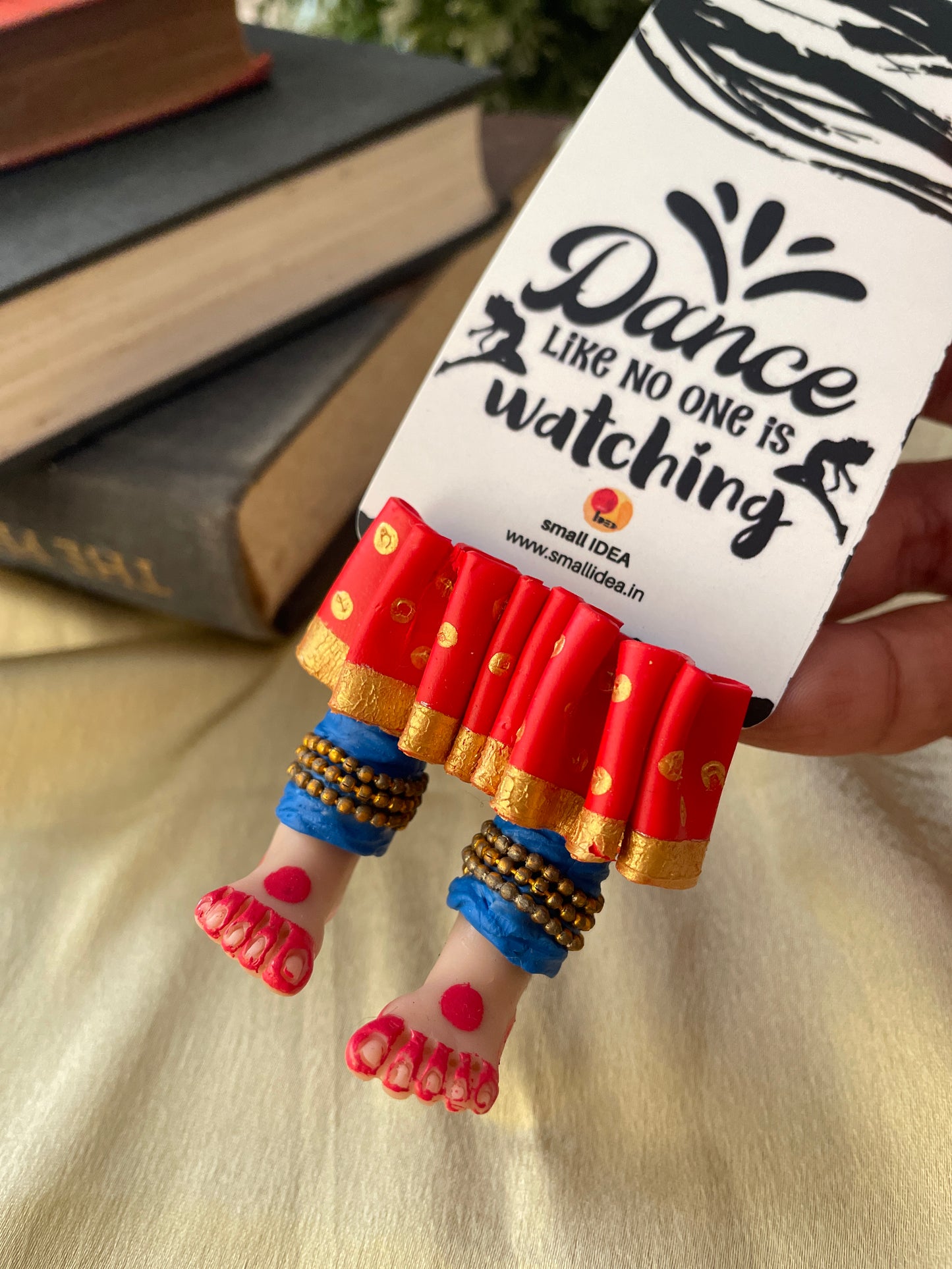 "Laissez-vous libre !" dit ce magnifique marque-page miniature aux longues jambes fait à la main danseuse kathak ! Conçu pour encourager un lecteur de livre à cesser de se retenir, ce marque-page personnalisé affiche des lignes éclairantes. Ce marque-page les présente dans une essence indienne en incluant la moitié inférieure des jambes et des pieds d'un mini danseur Kathak, avec anarkali, ghunghroos et alta !