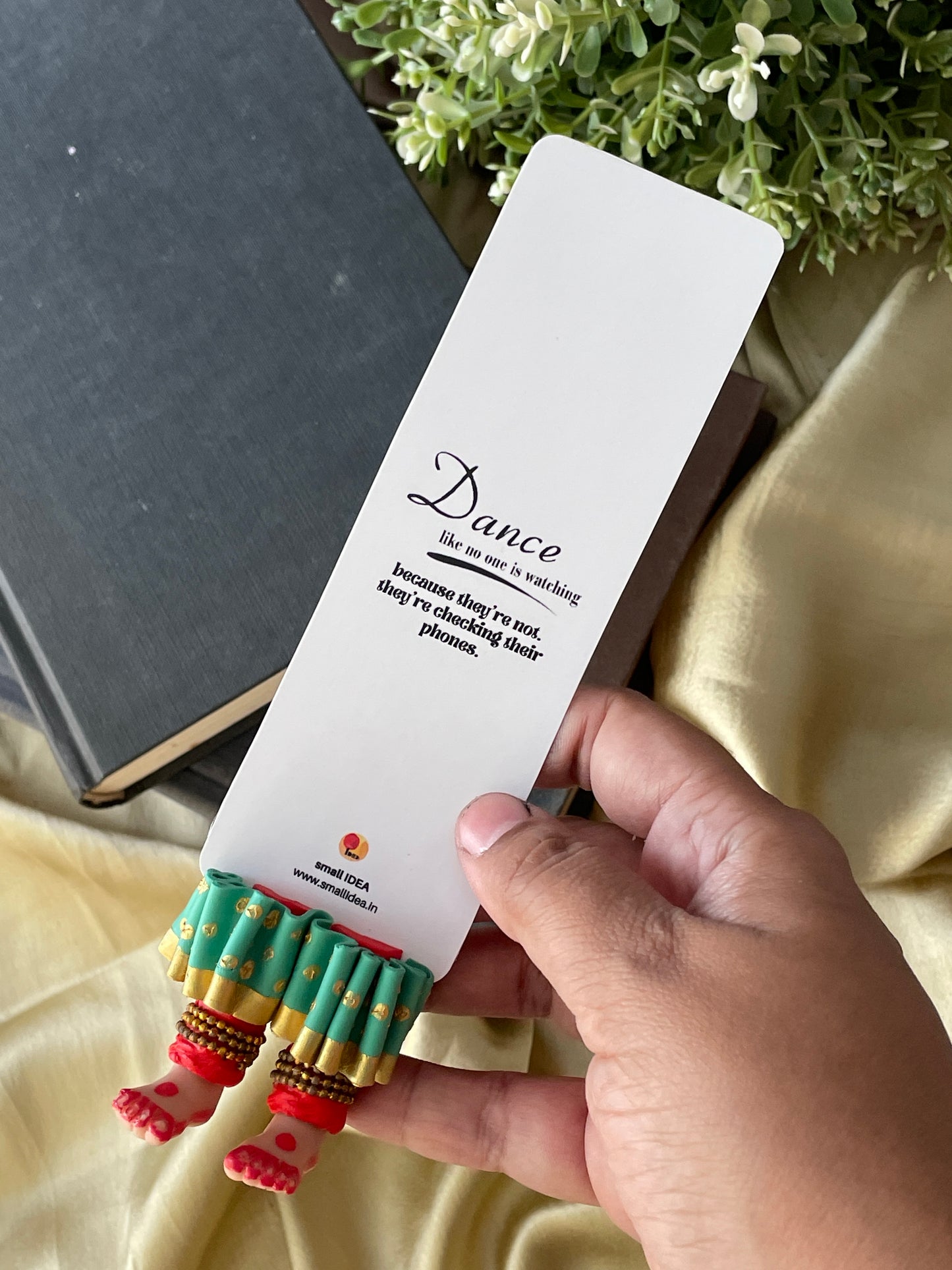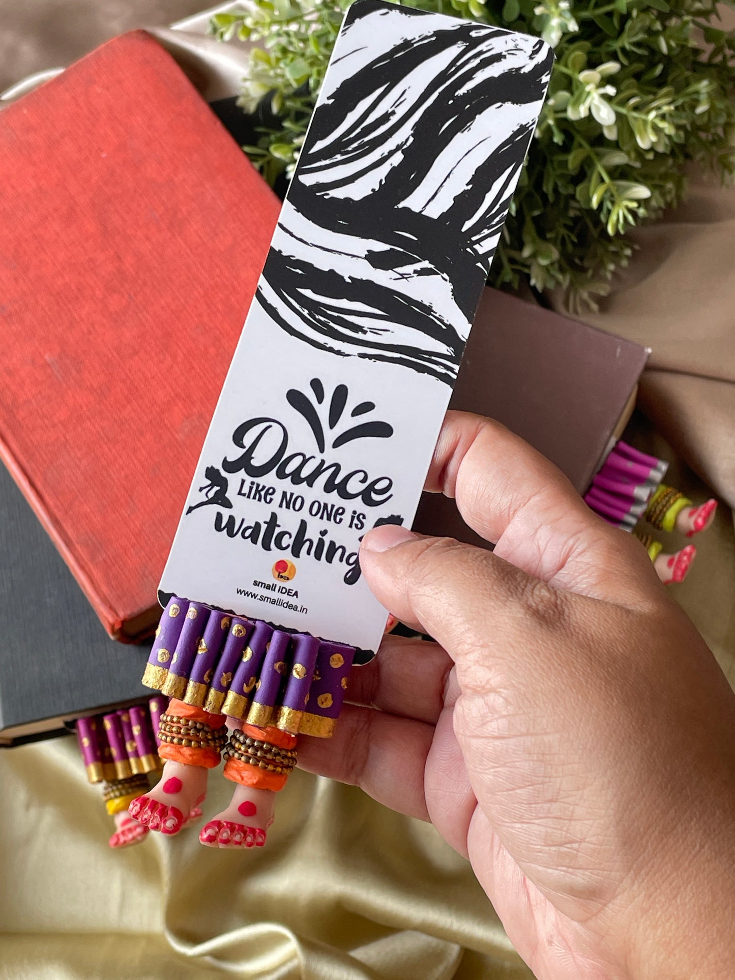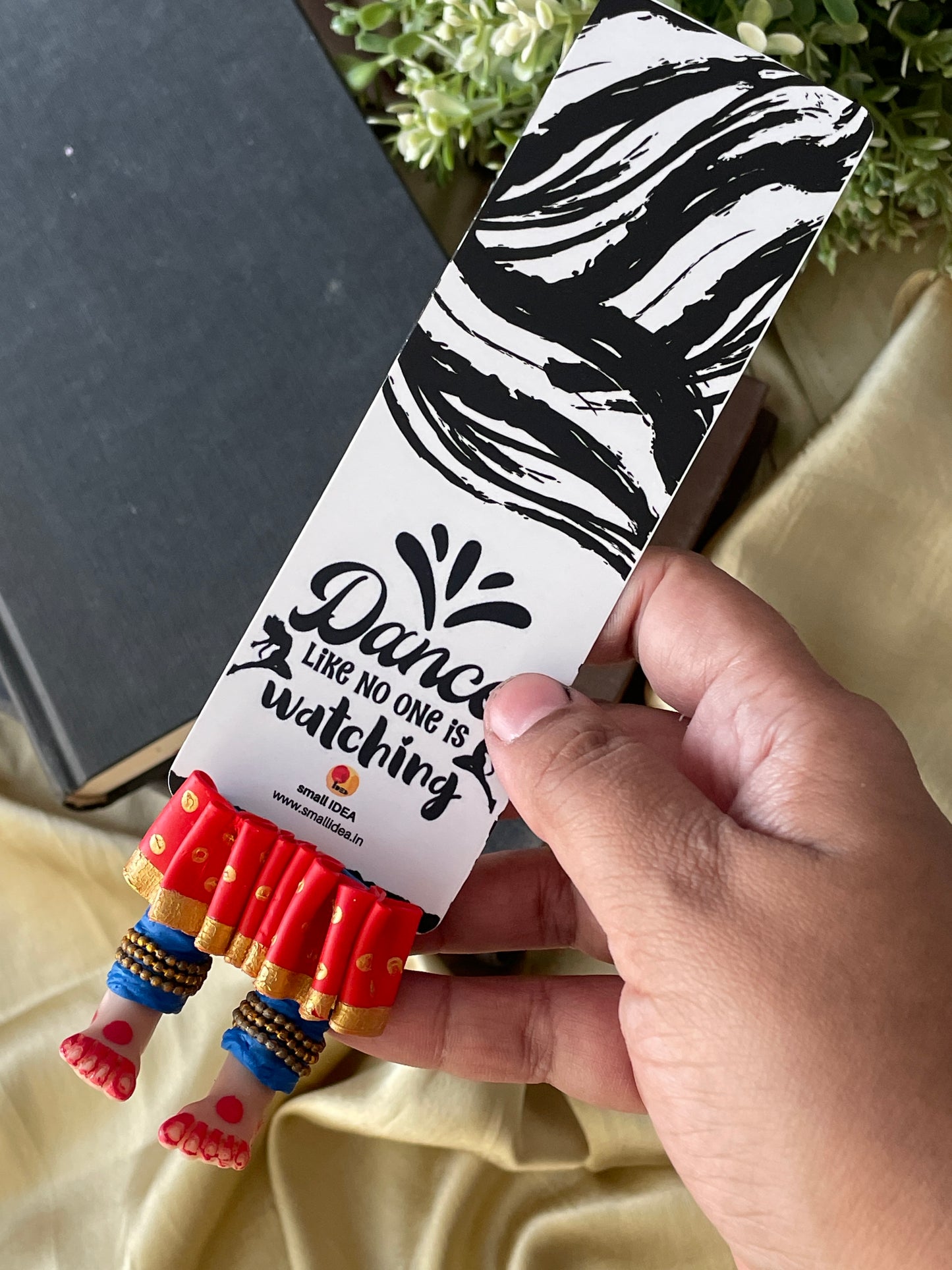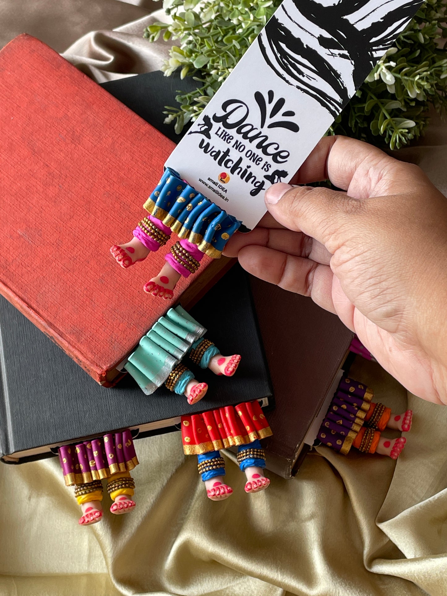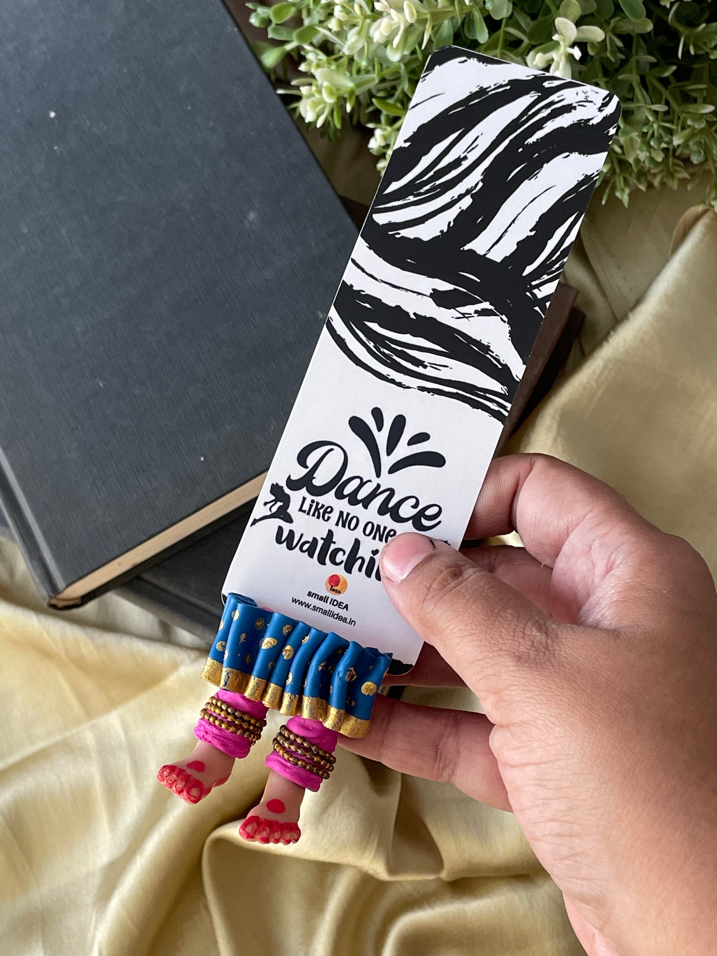 "Laissez-vous libre !" dit ce magnifique marque-page miniature aux longues jambes fait à la main danseuse kathak ! Conçu pour encourager un lecteur de livre à cesser de se retenir, ce marque-page personnalisé affiche des lignes éclairantes. Ce marque-page les présente dans une essence indienne en incluant la moitié inférieure des jambes et des pieds d'un mini danseur Kathak, avec anarkali, ghunghroos et alta !