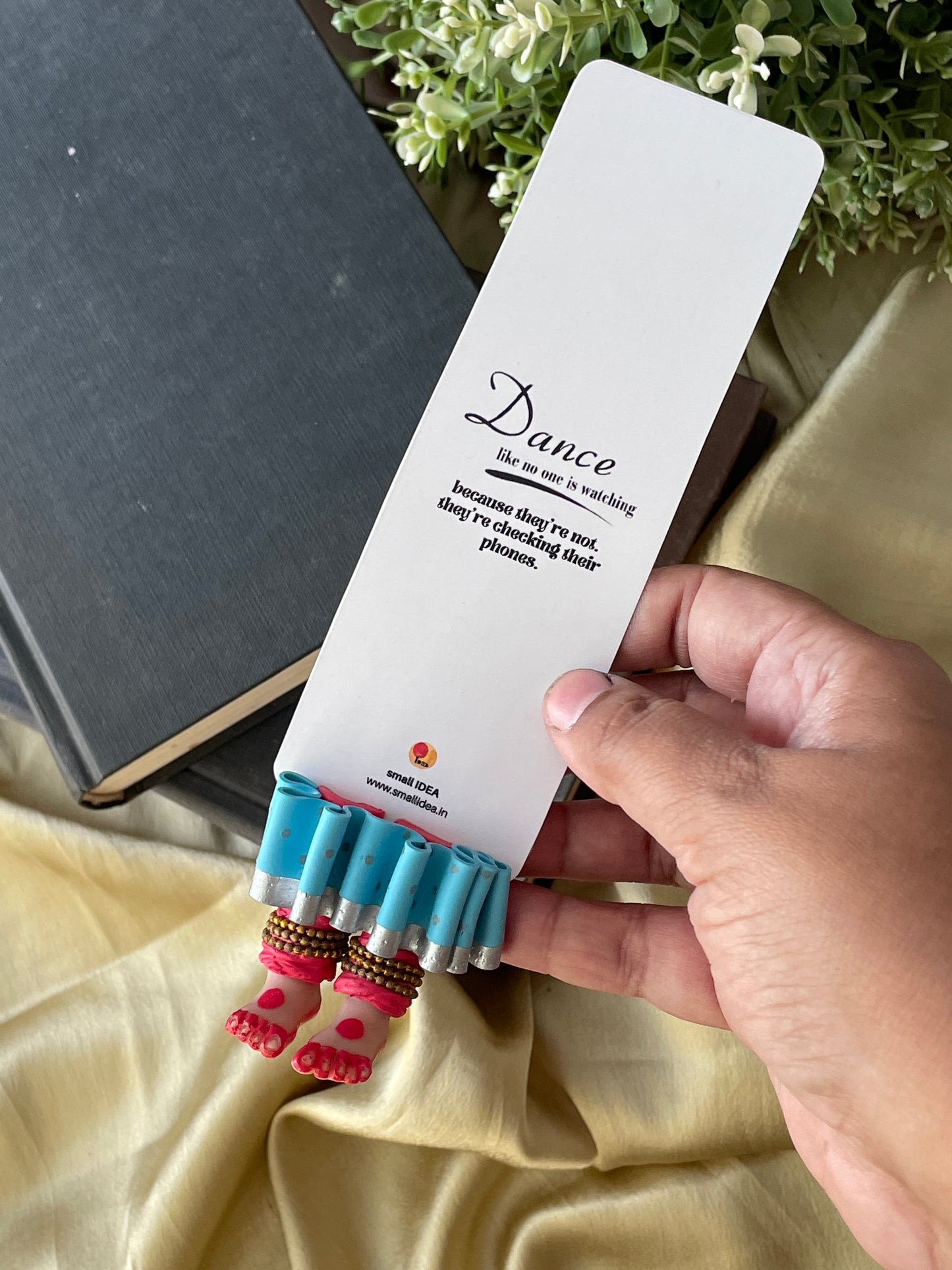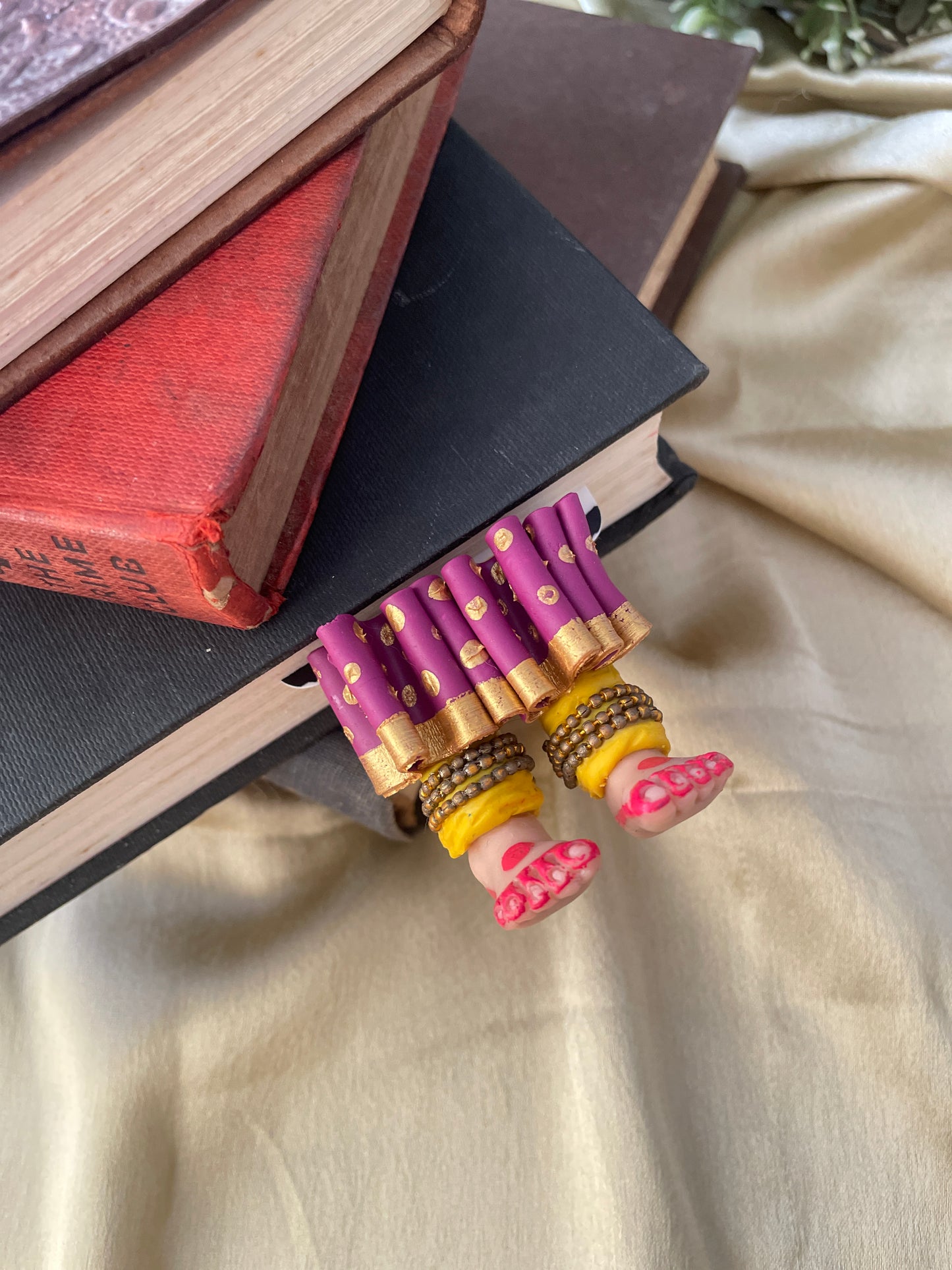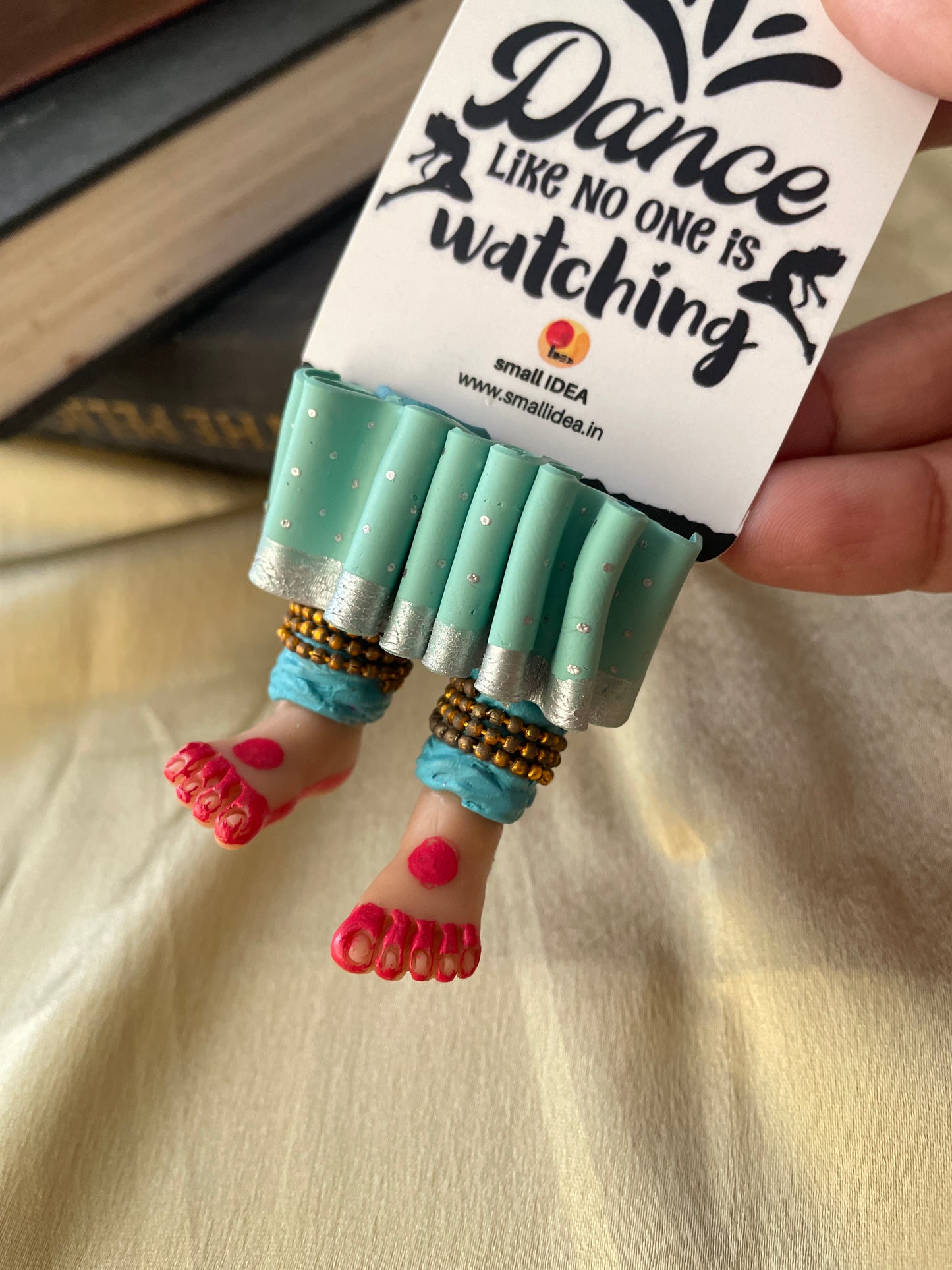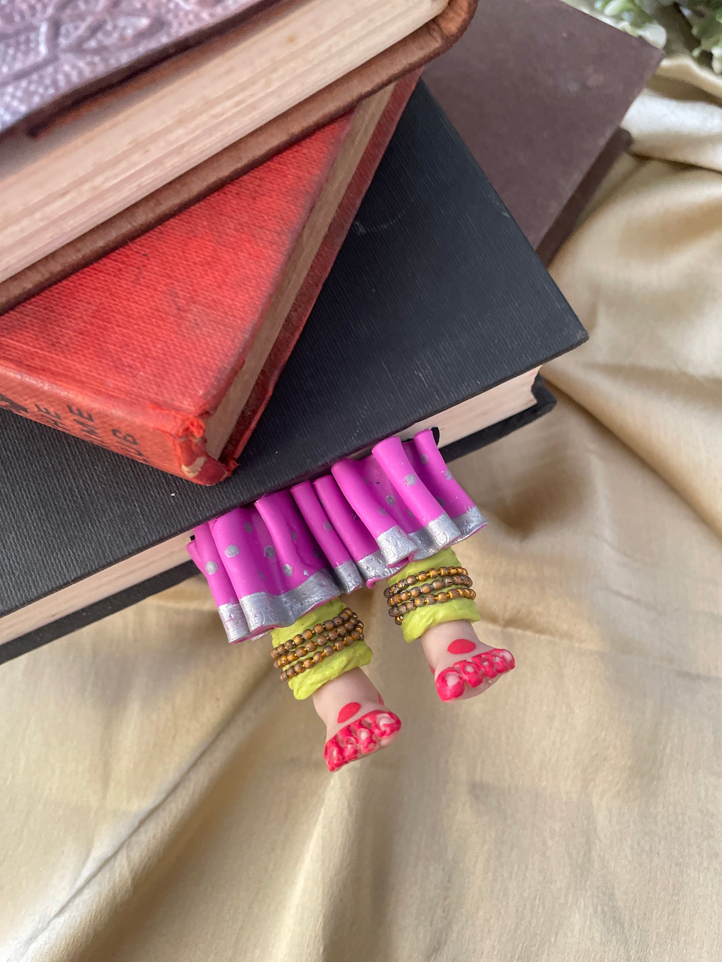 "Laissez-vous libre !" dit ce magnifique marque-page miniature aux longues jambes fait à la main danseuse kathak ! Conçu pour encourager un lecteur de livre à cesser de se retenir, ce marque-page personnalisé affiche des lignes éclairantes. Ce marque-page les présente dans une essence indienne en incluant la moitié inférieure des jambes et des pieds d'un mini danseur Kathak, avec anarkali, ghunghroos et alta !